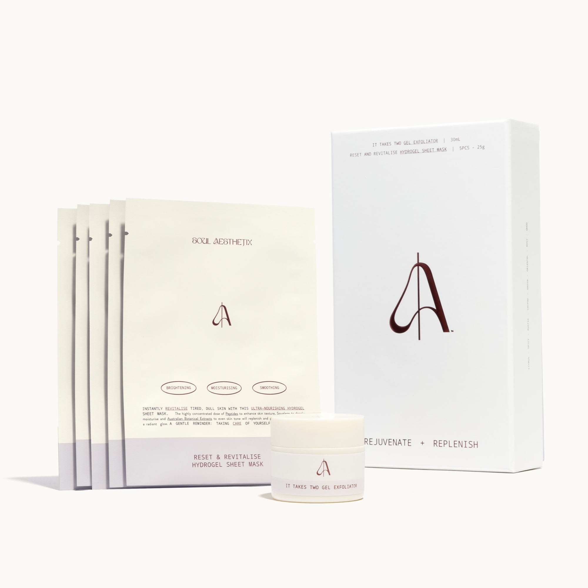 The Rejuvenate + Replenish system is ideal for oily or congested skin. The It Takes Two Exfoliator combines AHAs and BHAs to unclog pores and refine texture, while the Reset & Revitalise Hydrogel Sheet Mask hydrates without heaviness.